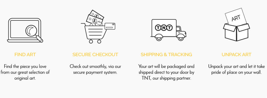 Your art will be sent to our packaging partner within 48 hours of receiving your payment. Once packaged, which normally takes around 2 days, it will then be collected and processed by TNT and you'll automatically be sent a tracking number so as you can follow your art on its way to you. And depending on your location, your art should then be with you within 8-10 days of shipping, ready to take pride of place on your wall. And we'll be with you every step of the way.